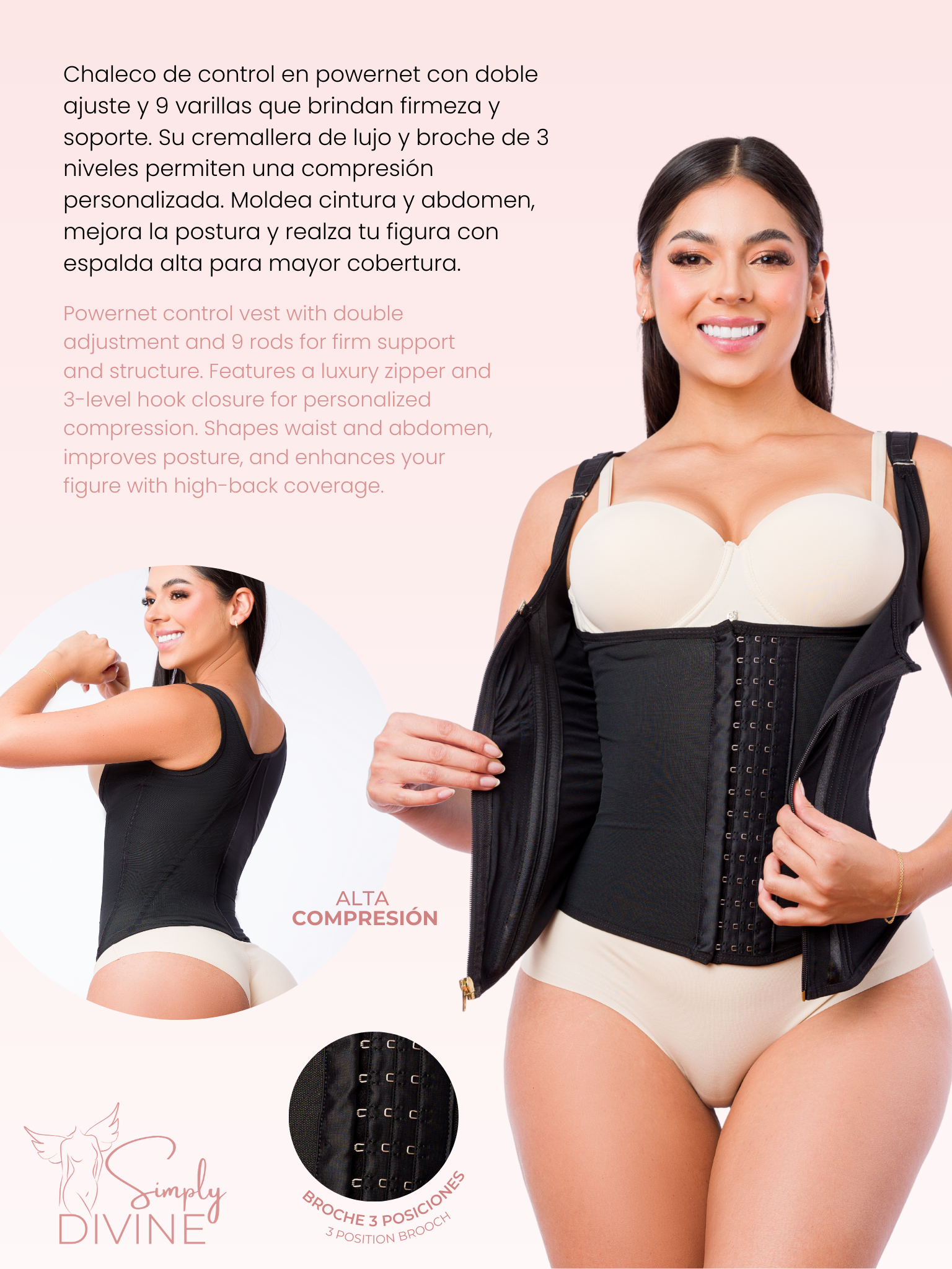 - Double adjustment system – Features a luxury zipper and internal 3-level hook-and-eye closure for maximum hold and personalized compression.